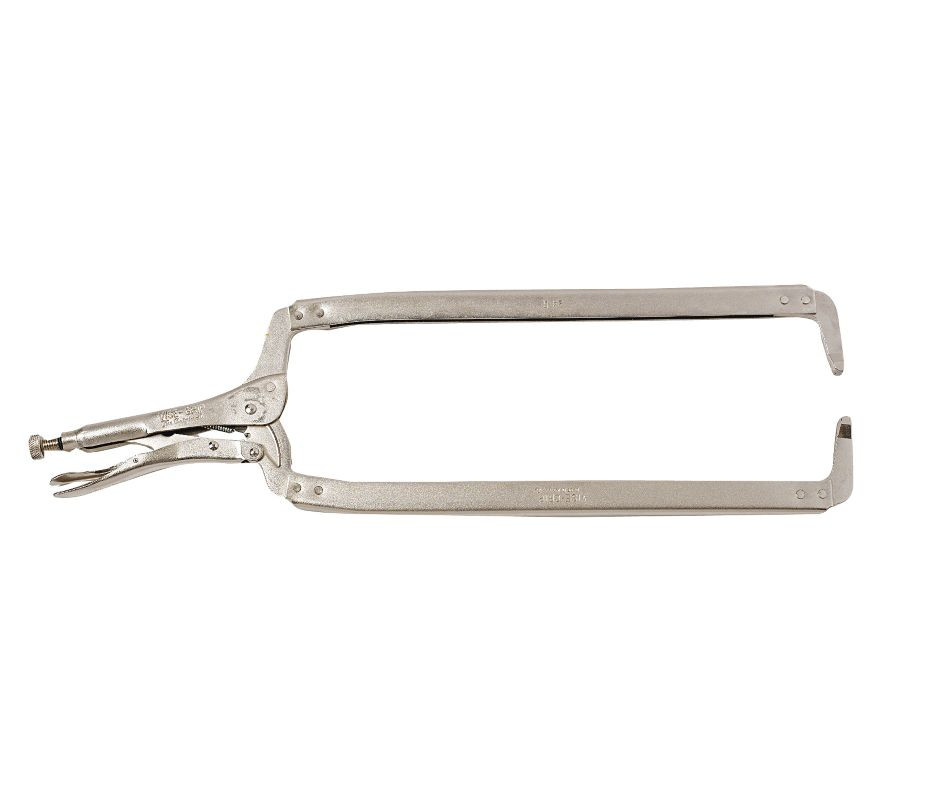 Locking C-Clamp, Number of Pieces 1, 24 In, Capacity 10 In, Throat Depth 15 1/2 In, Jaw Width 3/4 In, Jaw Type Fixed Tips, Clamping Force 2000 Lb, Locking Mechanism Release Lever, Screw Mechanism Adjusts Clamping Pressure, Pliers Length 24 In, Nickel Plated, Hardened Alloy Steel, Wide Opening Jaw, For Clamping Metal Parts for Fabrication and Welding